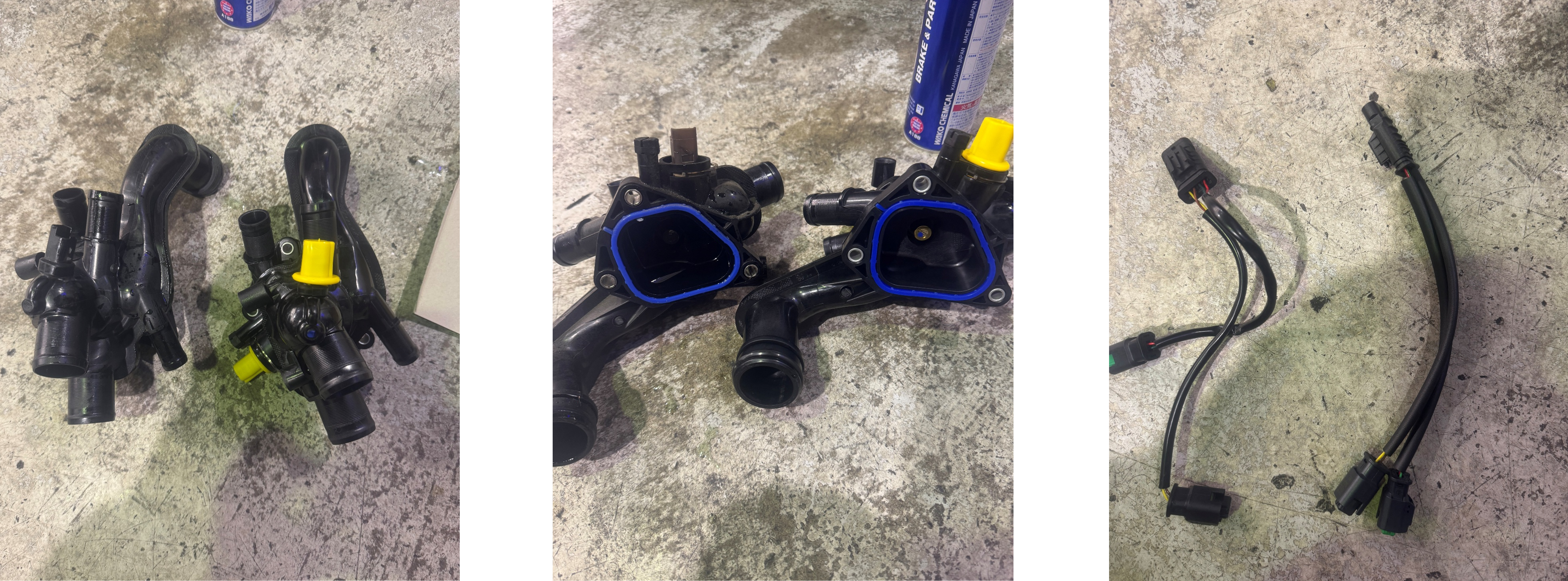 写真左と写真中央が新旧パーツの比較です。このほかにも、ハーネスの交換(写真右)も同時に行いました。