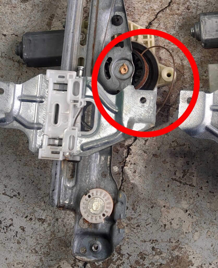 ①パワーウィンドウ故障に関しては、写真左の赤丸で囲んだ部分、パワーウィンドウレギュレーターのワイヤー切れによるものと判明しました。