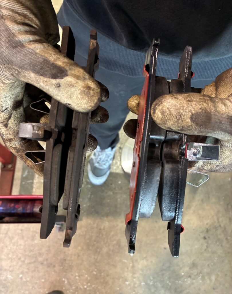 写真左が新旧ブレーキパッドの比較、写真中央が新旧ディスクローターの比較です。