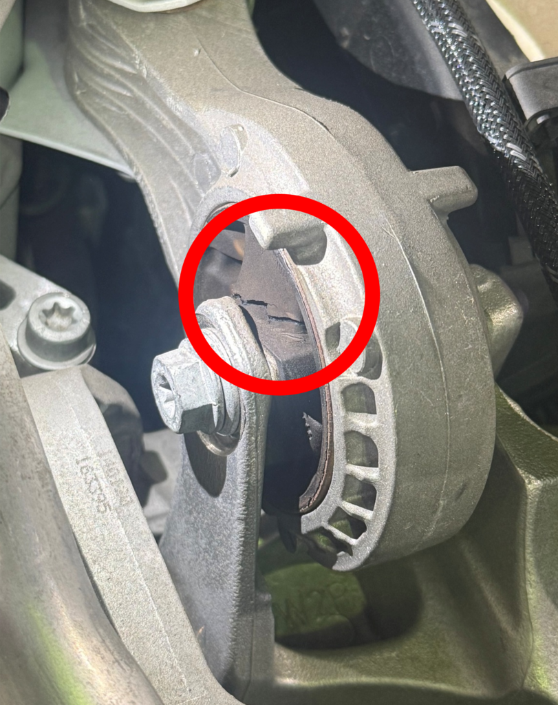 ⑤点検の際にエンジントルクロッドのヒビ割れが確認されたことから、交換を提案させていただき、ご承諾いただいたことから、トルクロッドの交換を実施しました。