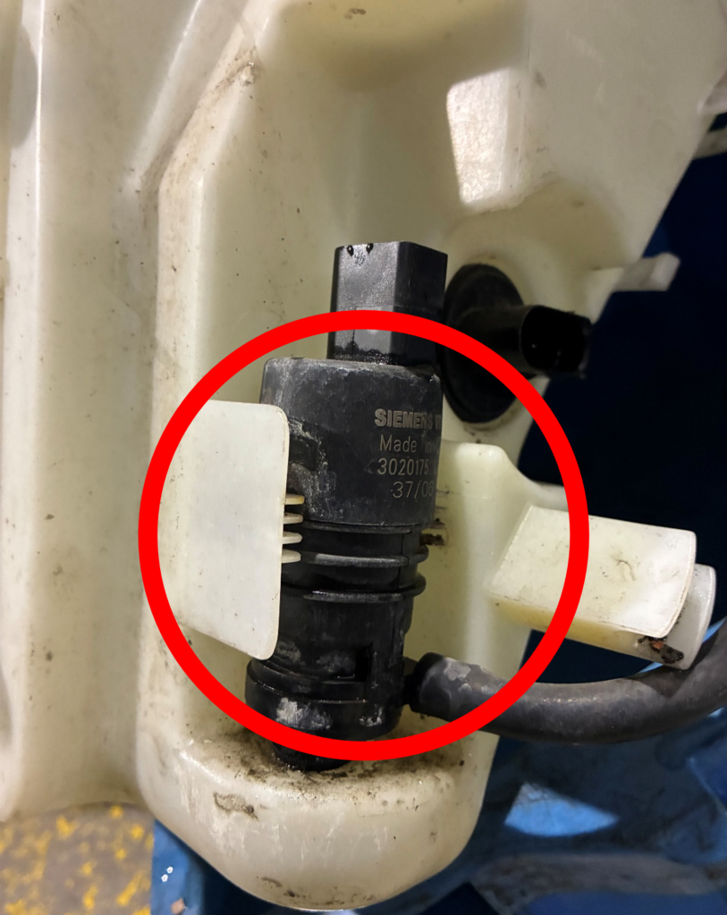 ④ウォッシャー液が出ない件に関しては、写真中央の赤丸で囲んだ部分、ウォッシャーポンプの故障が原因であったことを確認しました。