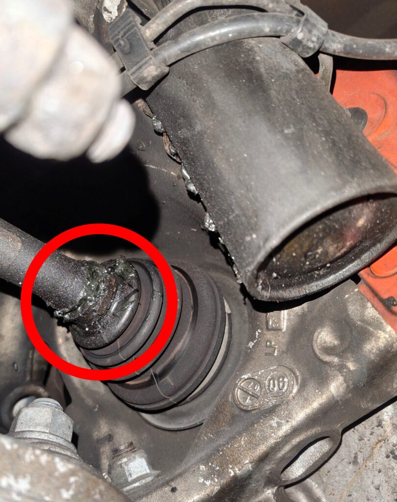 ⑥写真左の赤丸で囲んだ部分、フロント右のドライブシャフトブーツバンドより、グリス漏れが確認されました。