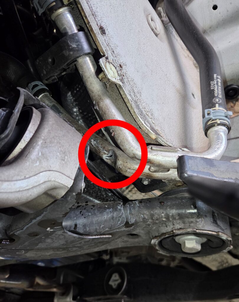①水漏れに関しては、写真左の赤丸で囲んだ部分、フロント右のインナーフェンダー内にあるヒーターパイプが破損し、穴が開いていることを確認しました。
