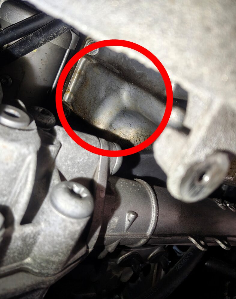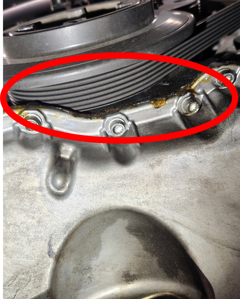 また、写真中央と右の赤丸部分、エンジンオイルパンとヘッドカバー部分に滲みが確認されましたが、お客様都合で交換対応を実施しなかったことから、今回は応急処置として清掃作業を行いました。