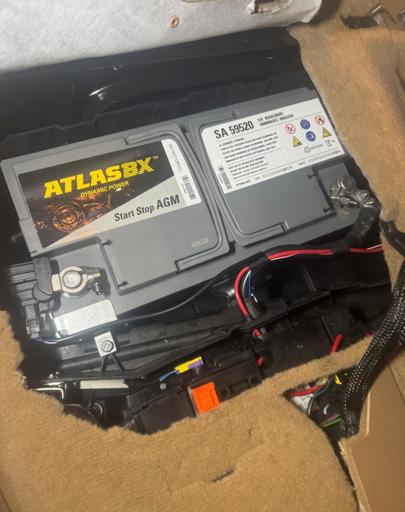 お預かり後に点検を実施。バッテリー交換(写真左)やブレーキフルード交換・エア抜き、ブレーキメンテナンス(清掃・グリスアップ)、エンジンオイル・オイルフィルター交換などの作業を実施しました。