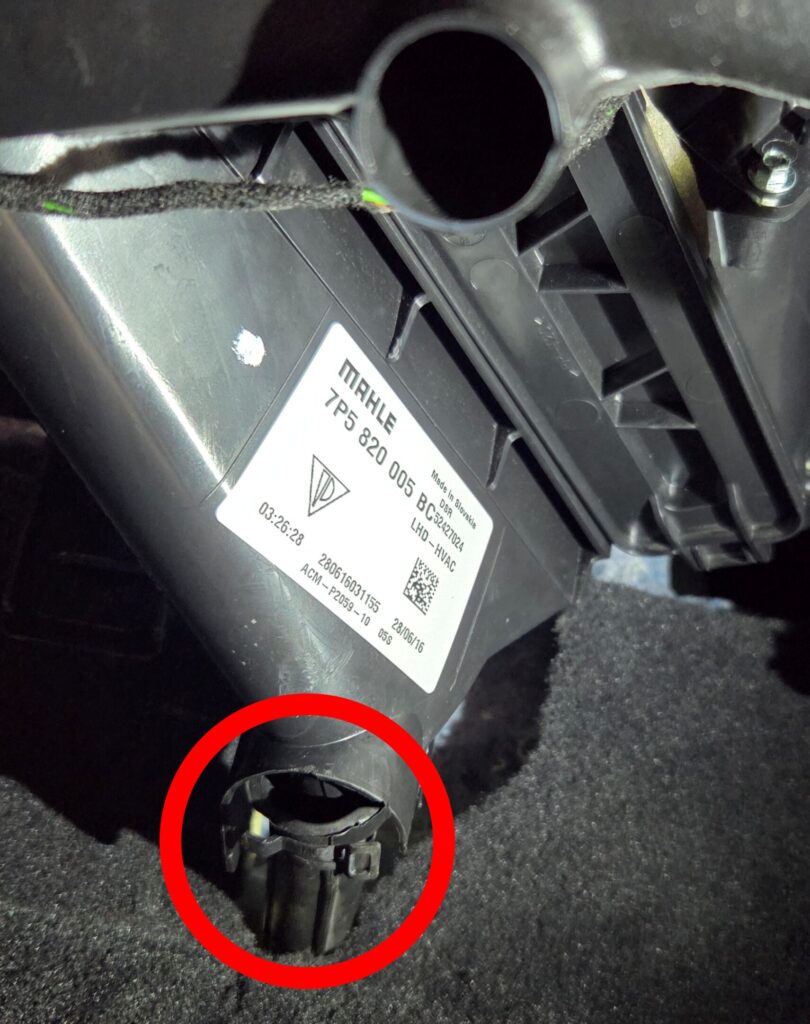 点検の結果、助手席側の足元浸水に関しては、【ドレンホースの詰まり】が原因でした。