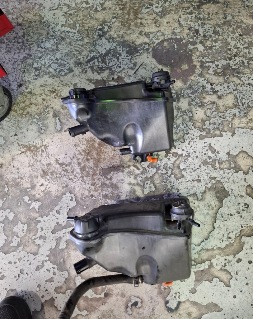 写真左がラジエーターサブタンクの水漏れで、鏡に映っている白い汚れが水漏れ跡です。写真中央は新旧ラジエーターサブタンクの比較です。