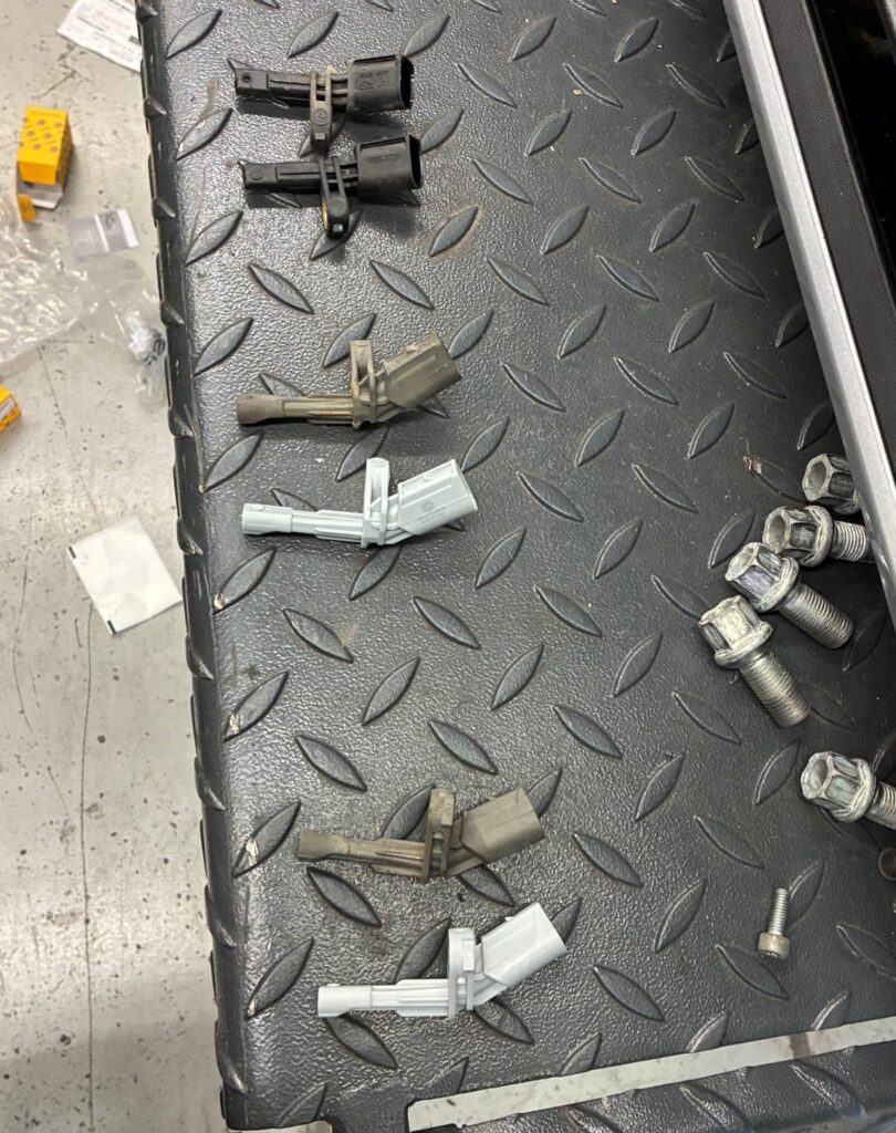 前回入庫時の作業では、スピードセンサーに問題があったことから、1カ所のみ交換を行いました。今回の作業では、他の3カ所のスピードセンサー交換も実施しました。