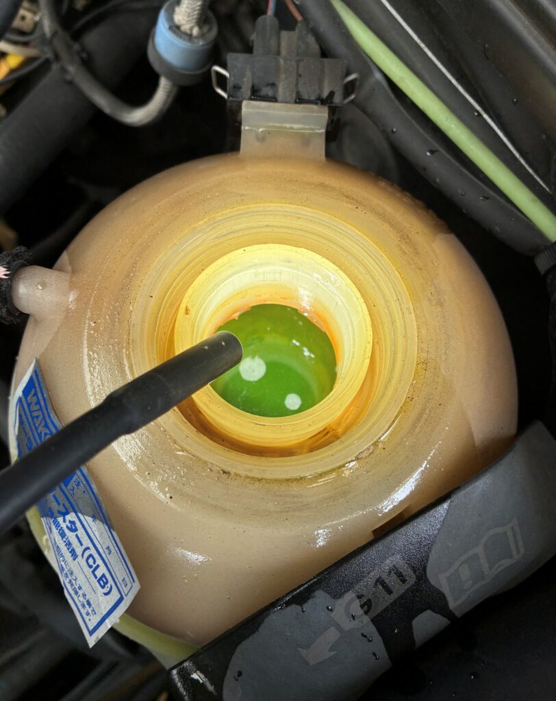 写真左の黄色い汚れが、冷却水漏れの様子です。
