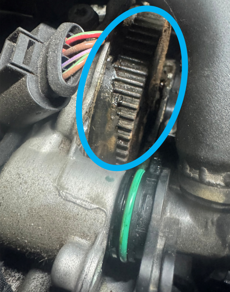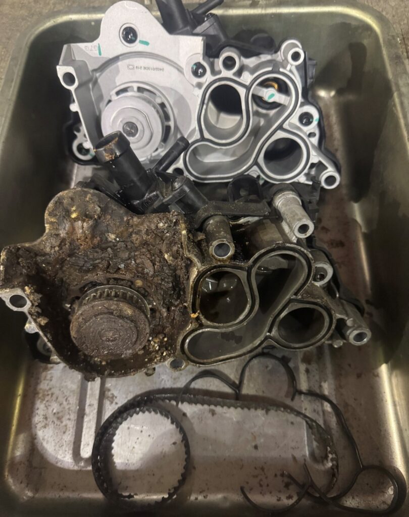 水温上昇に関しては、ウォーターポンプ部分から冷却水漏れが確認されたことが大きな原因であることが判明したため、交換を実施しました。