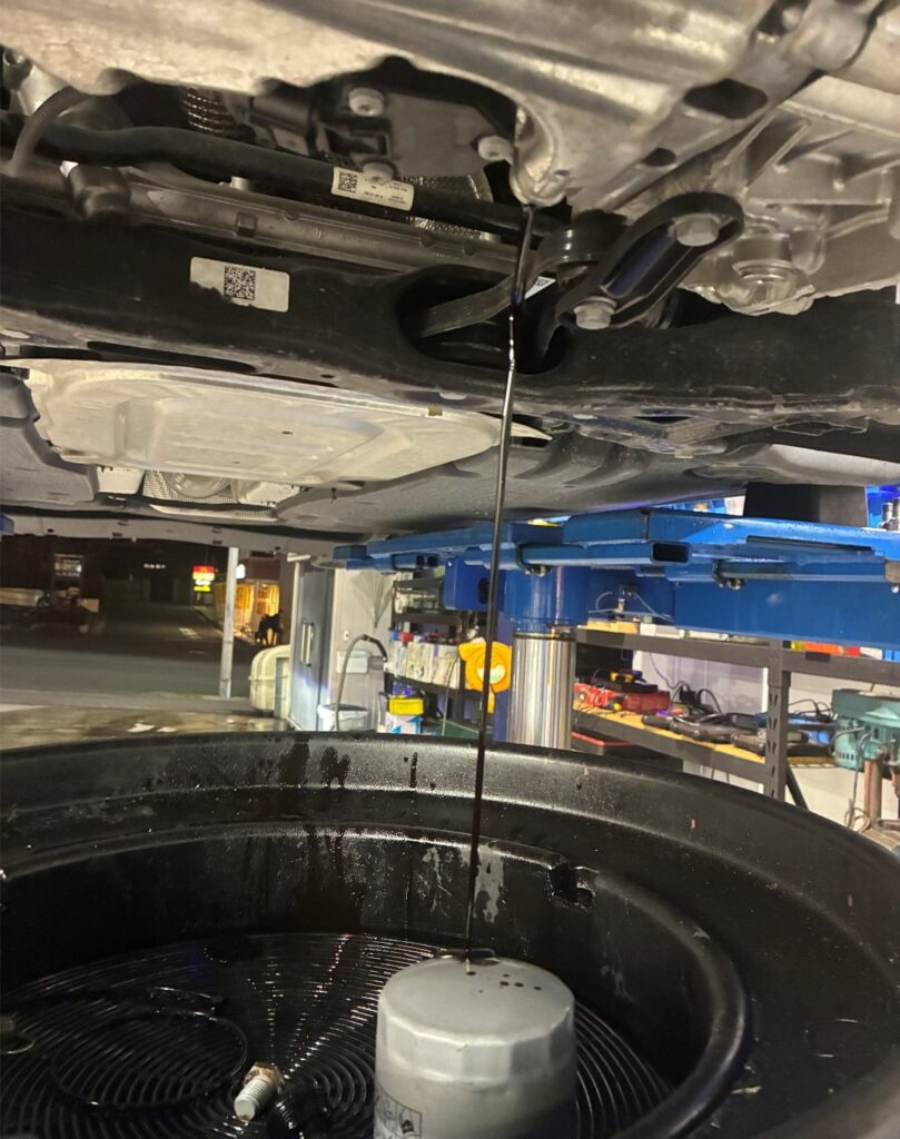 ③エンジンオイル・オイルフィルター交換を実施しました。(写真右、交換作業時の様子)