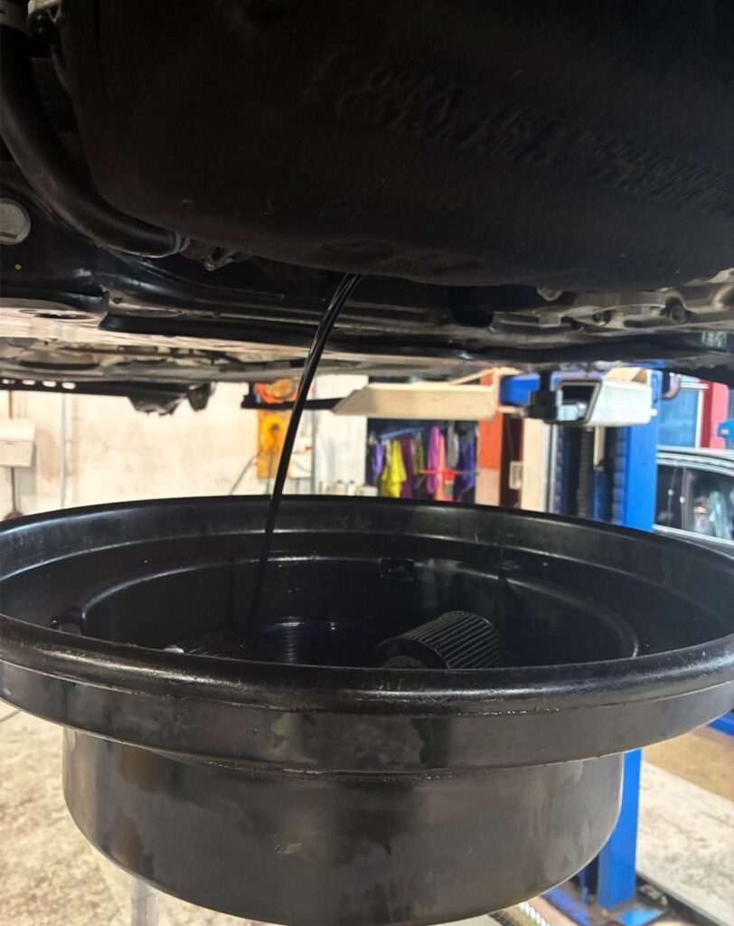 ②エンジンオイル・オイルフィルター交換を実施しました。(写真中央、エンジンオイル交換作業時の様子)