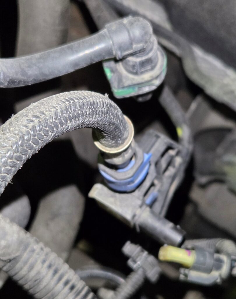 ①エミッションシステムの警告灯に関しては、圧力を感知するプレッシャーセンサー(写真左のコード)からの信号不良が原因であると思われることから、プレッシャーセンサーの交換を実施しました。