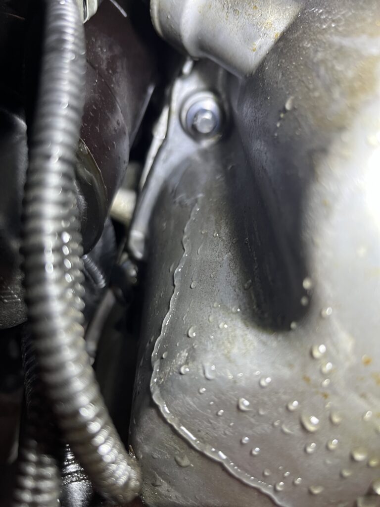 この部分から冷却水が漏れると、エンジンの側面を伝って広範囲に水漏れが広がります。写真右は、オイルフィルターハウジングからの水漏れによって、車体下部まで冷却水が垂れた際の様子です。