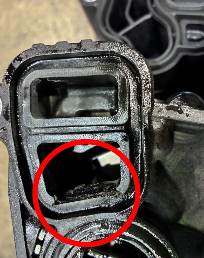 この箇所には、高温になったエンジンオイルと冷却水が近くを流れることでオイルを冷やすのですが、写真左の赤丸で囲んだ部分のように、冷却水側のガスケットに亀裂が発生すると、この部分から水漏れが発生します。